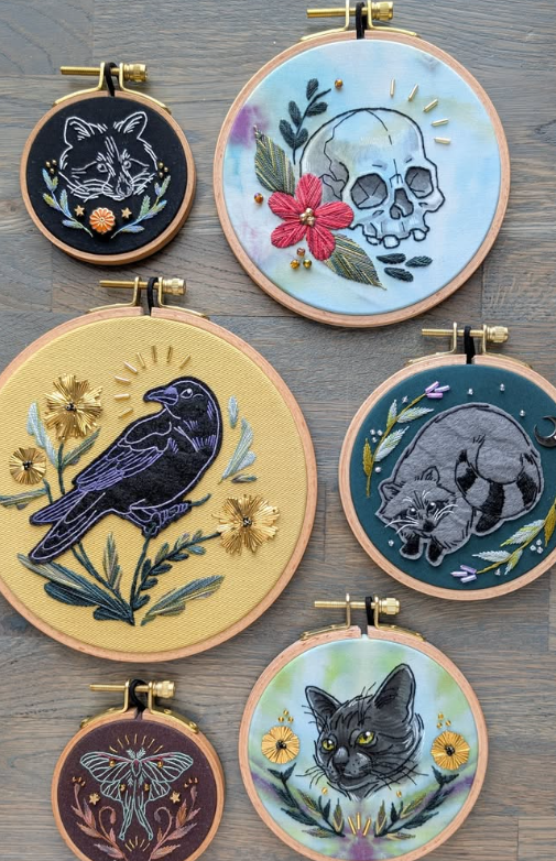 The Thistle Finch Designs line of work includes a variety of one of a kind, hand-embroidered artwork, apparel, jewelry, and accessories.