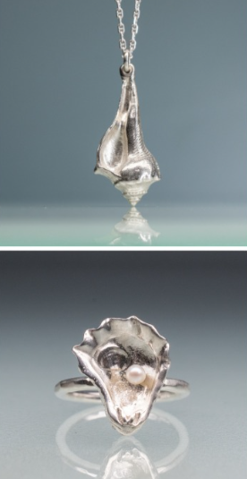 HKM Jewelry by Hali MacLaren is a line of heirlooms for ocean lovers. Each piece is handmade from found seashells, which are molded and cast into solid sterling silver replicas.